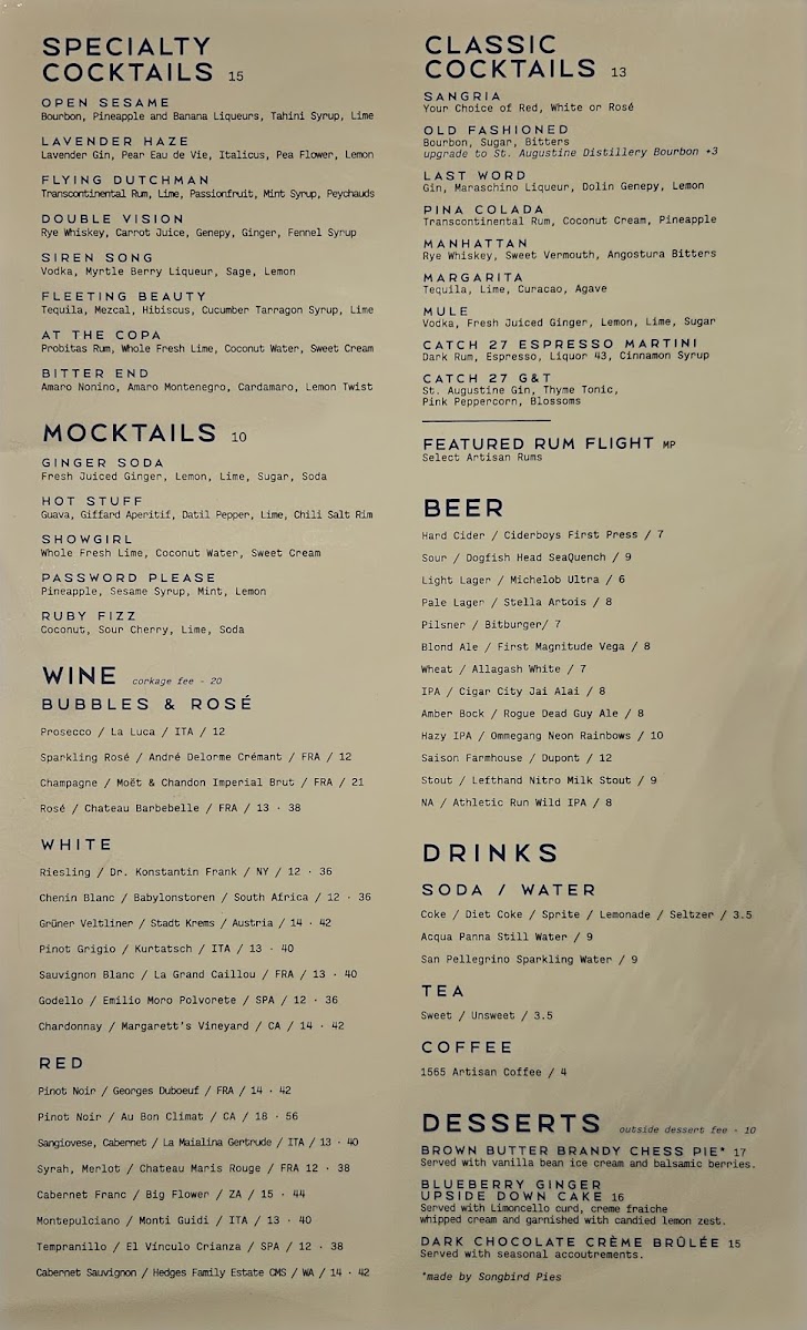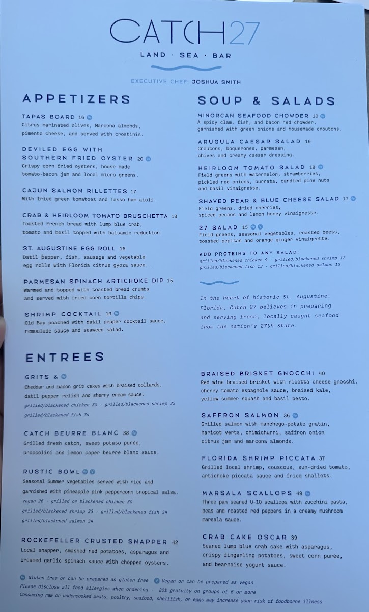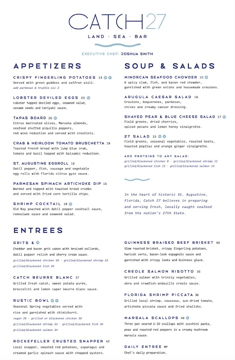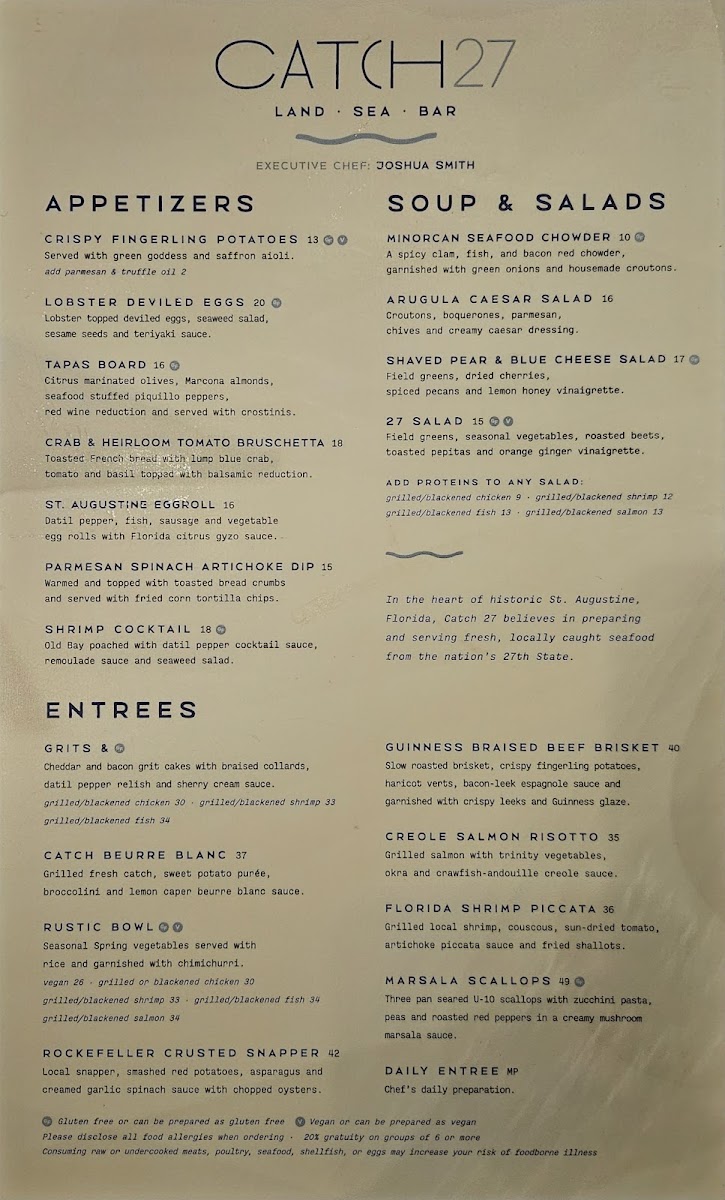 Welcome to Catch 27, a seafood lover's paradise nestled in the charming streets of St. Augustine, Florida. This vibrant restaurant, located at 40 Charlotte St, offers an elevated dining experience that beautifully melds innovative Southern-inspired seafood with a relaxed atmosphere that feels both welcoming and intimate.